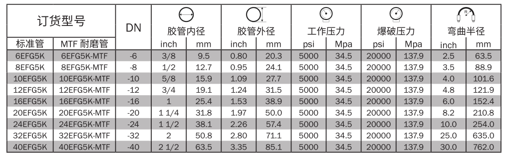 超耐磨外膠層 MTF(MegaTuff):適用于頻繁摩擦的工況且無需使用彈簧或尼龍護(hù)套,耐臭氧、紫外線及老化性能,按照 ISO 6945 耐磨測試標(biāo)準(zhǔn),MTF 外膠比標(biāo)準(zhǔn)膠管